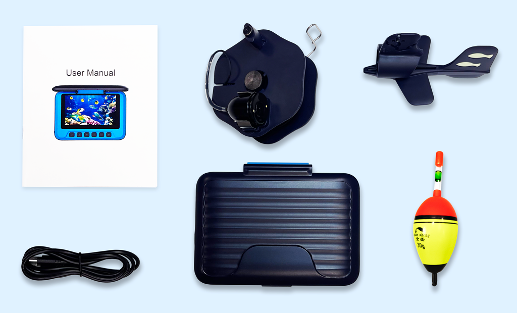 В названии не просто так присутствует слово «Kit», т.е. «набор». В него входят: мини-кейс с дисплеем и кнопками управления, катушка для провода камеры, сама камера, поплавок, стабилизатор для камеры под водой и провод Type-C для зарядки устройства. Кейс выполнен из прочного пластика, крышка закрывается плотно и защищает экран от царапин и физического воздействия. Катушка устанавливается сбоку, просто вкручивается в резьбу. Также снизу есть резьба для крепления кейса на штатив для более комфортного использования.